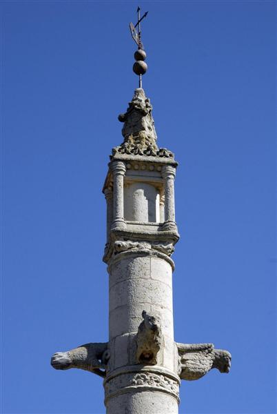 En el segundo tercio, otro anillo con grutesco y encima cuatro animales a modo de ménsulas. Se remata con una especie de baldaquino con columna interior y decoración de bolas.